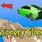 Slippery Slope tests your reflexes and precision as you hurtle down slippery, winding ramps filled with obstacles. The ramps are high, narrow platforms that curve through the air. They offer great visibility, but a wrong turn will hurt. Drive as far as possible, earn points by collecting gold coins, perform stunts, and surpass your high score, or in some versions, complete specific levels as your goal.